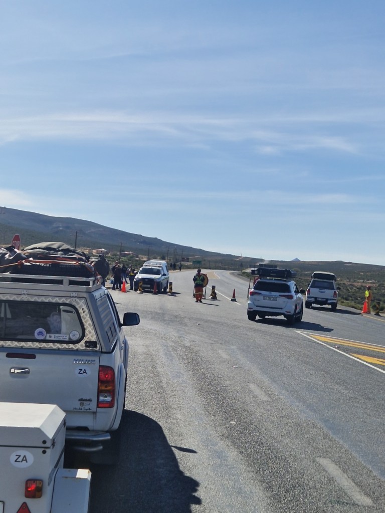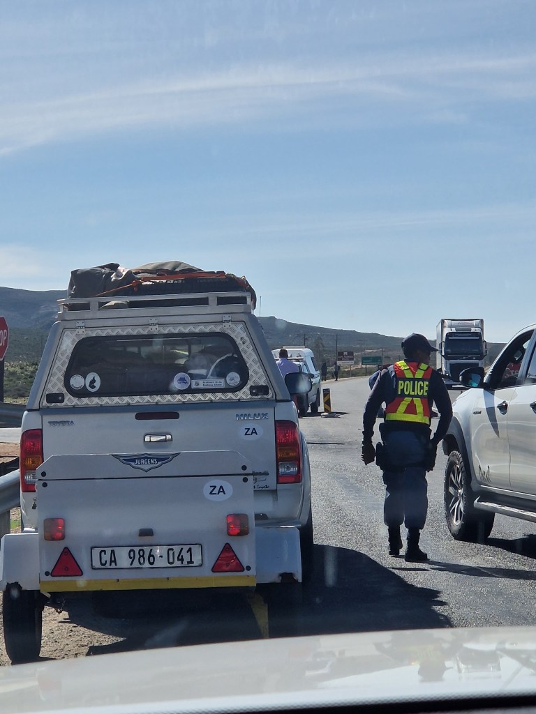 In Steinkopf there was a police roadblock related to the washed away road but miraculously after some fine Walker (both Kevin AND his brother, Andrew) negotiations and some calls to the South African Highways Agency we were allowed through after about an hour. We’re still not entirely sure how legit this was!!!
