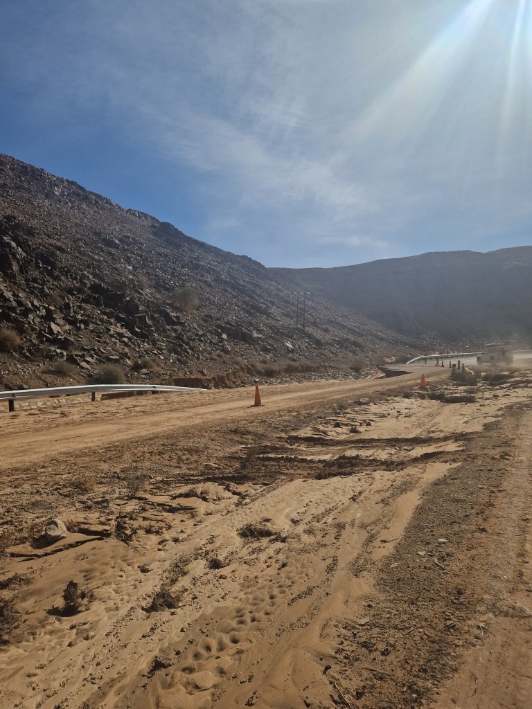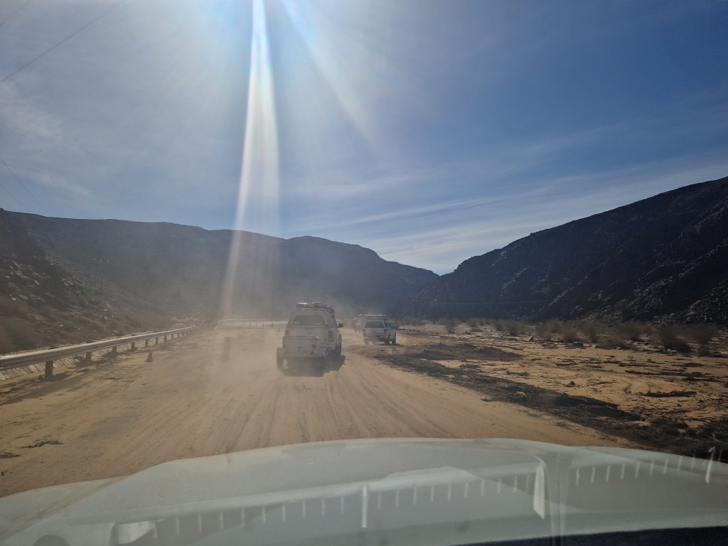 We had left the flat open desert and entered a valley when we suddenly saw the road, or lack thereof. Not a drop of water remained but neither did much of the tarmac! The road had been rerouted onto the dirt / gravel on the hillside and we were all thanking our lucky stars that Avis had upgraded us to a bigger and sturdier SUV!