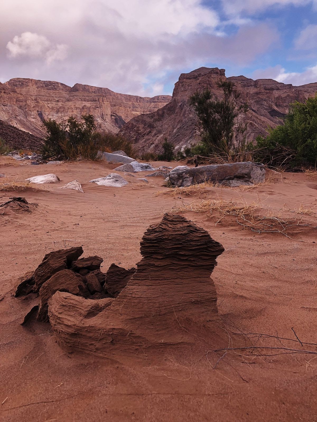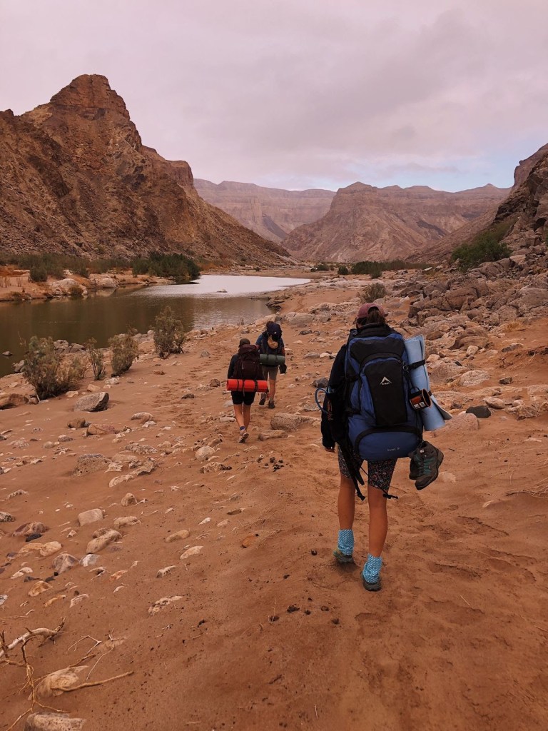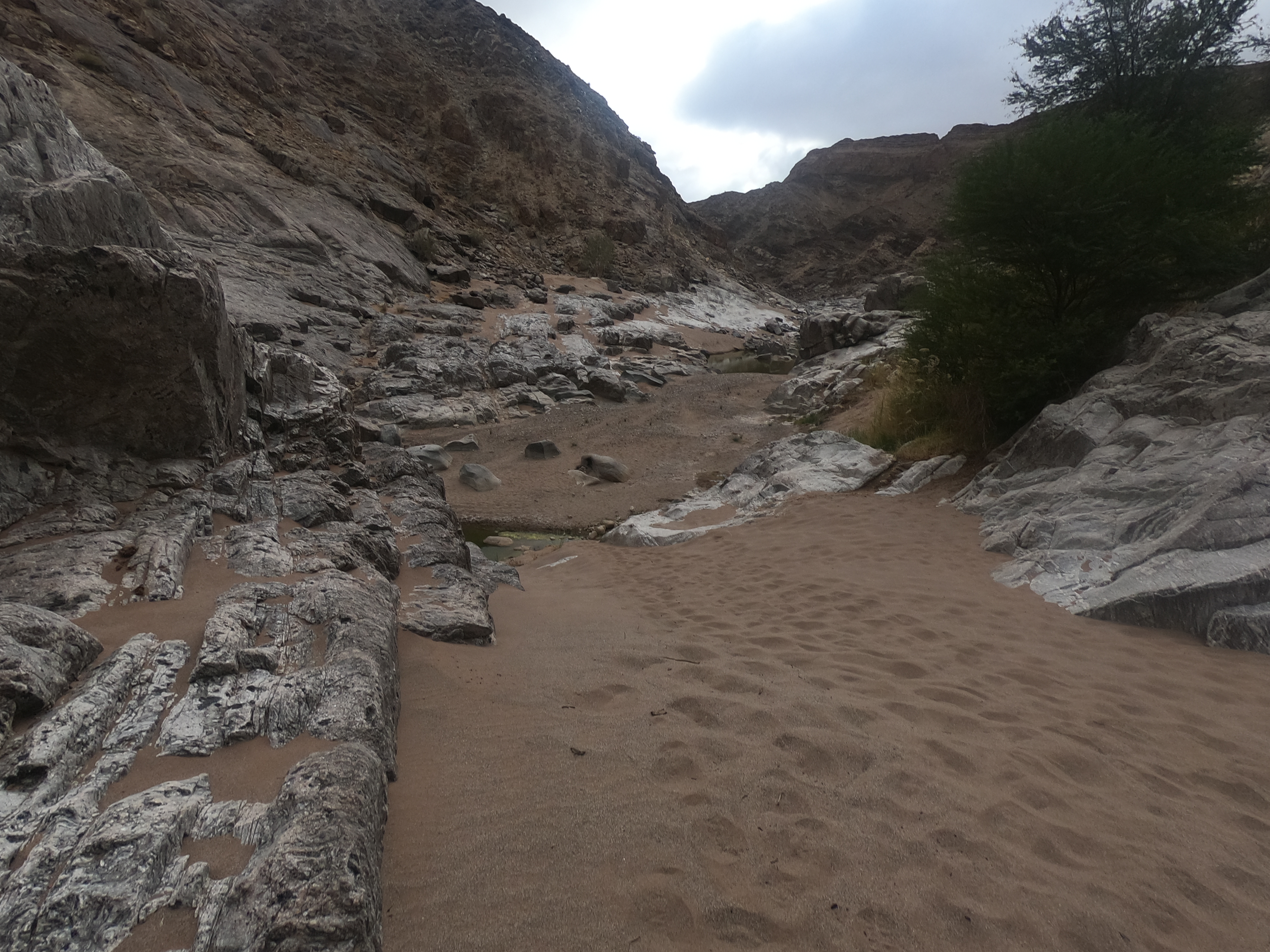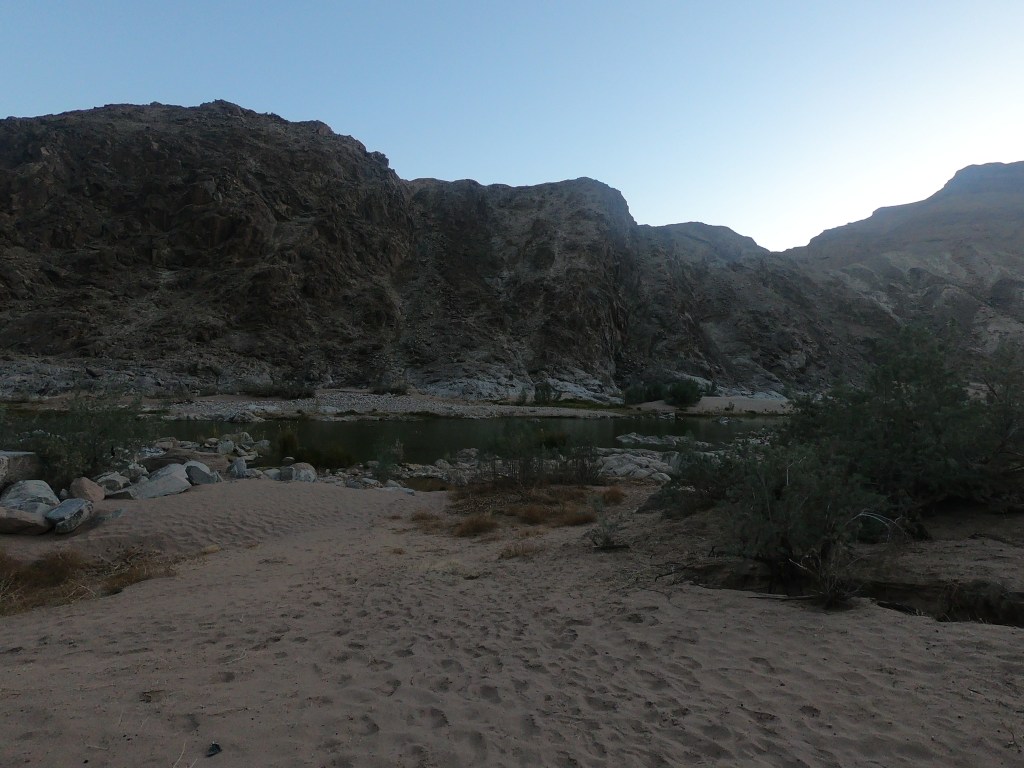 We crossed a final sandpit and heard the boys ahead shouting, “Water!“, “Baboons!“. Sadly by the time we got to them the baboons had made off but there was a lot of water and we managed to find a sheltered spot that was clearly popular with many of the hikers on the trail, too popular in fact from the amount of dirty loo roll (!!) and litter strewn around. BUT, beggars couldn’t be choosers and we set up camp.