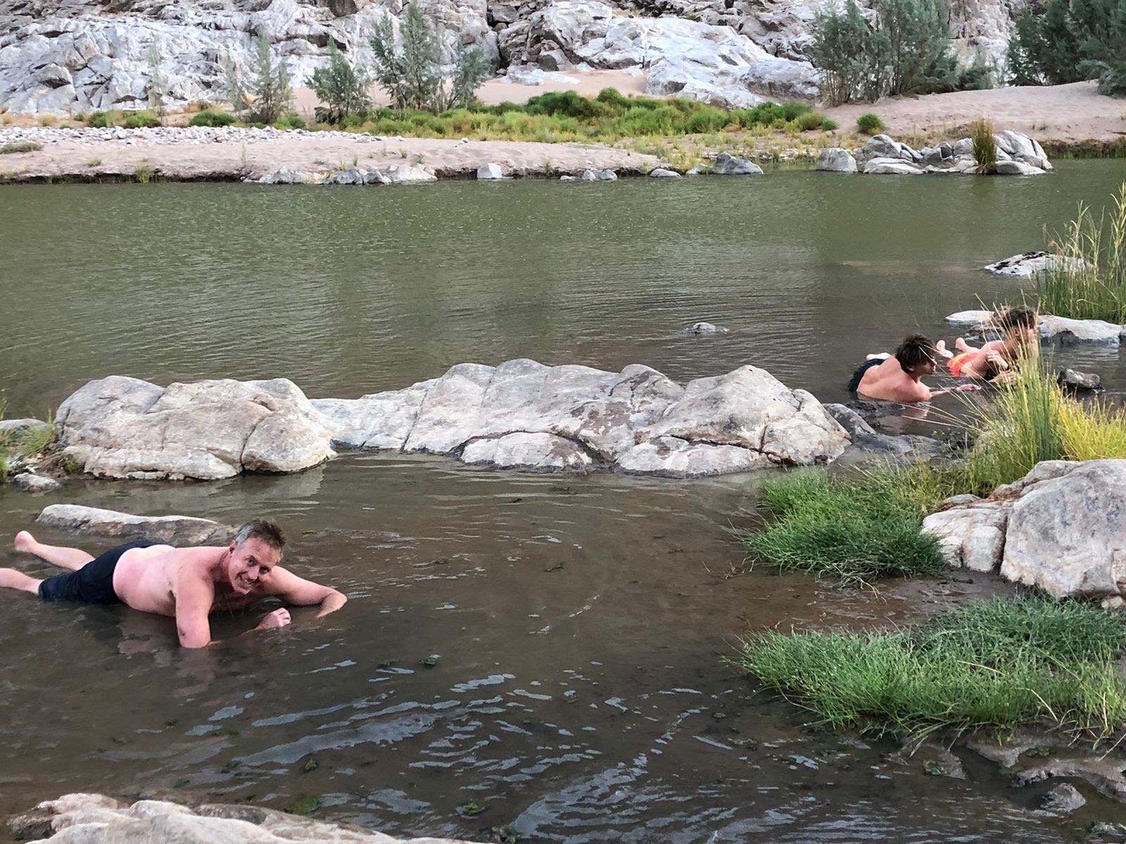 At 15km there was a hot springs (called, ironically, ‘Palm Springs’) and this is where we had to get to. It was an almighty effort but there was nothing for it but to keep going as it got colder, darker and windier..! Chris piped up, “There must be suffering!“